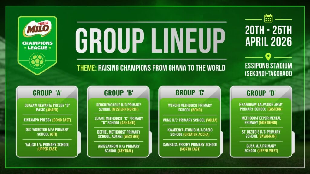 The 2026 Milo U-13 Champions League is scheduled to take place from April 20 to April 25 at the Essipong Stadium, where young talents from across the country will compete for honours and continue the legacy of one of Ghana’s most impactful grassroots football initiatives.