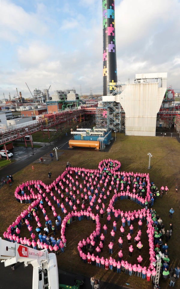Employees of Covestro Deutschland AG, in Brunsbüttel, Germany, set the Guinness World Record for the largest human jigsaw puzzle piece, which had 548 participants.