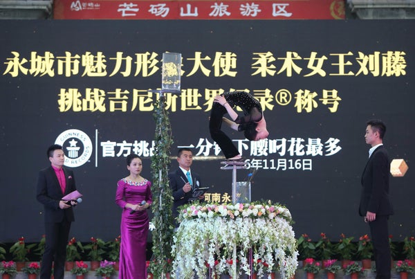 China’s Liu Teng managed to pick 15 flowers in her mouth in one minute while doing a contortion backbend.